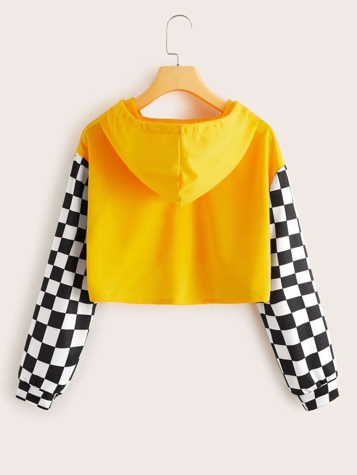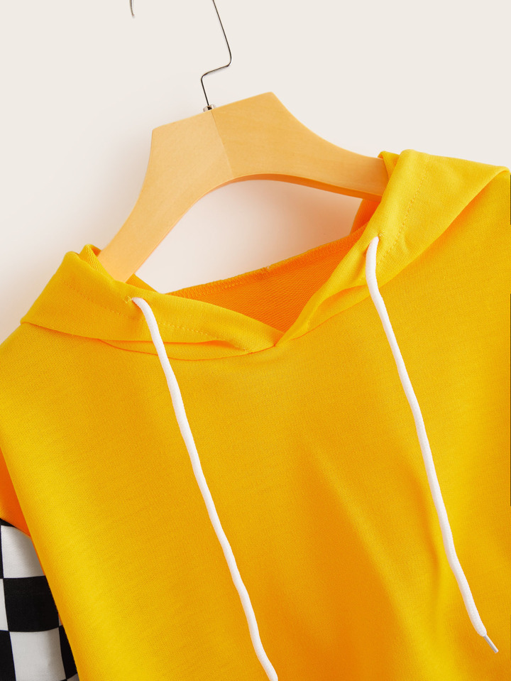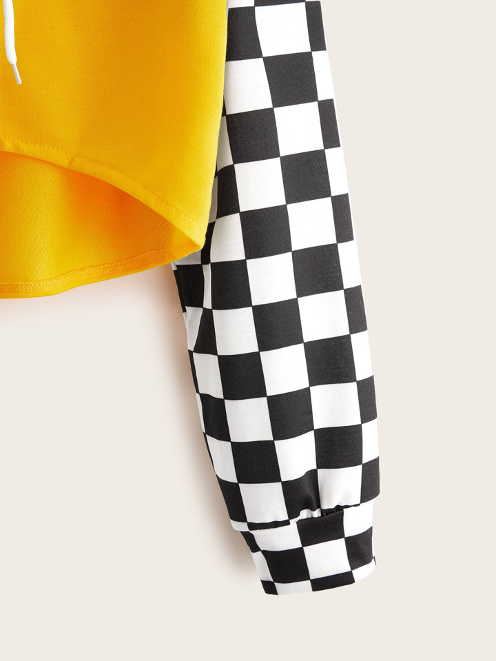 Contrast Checker Sleeve Dip Hem Drawstring Hoodie