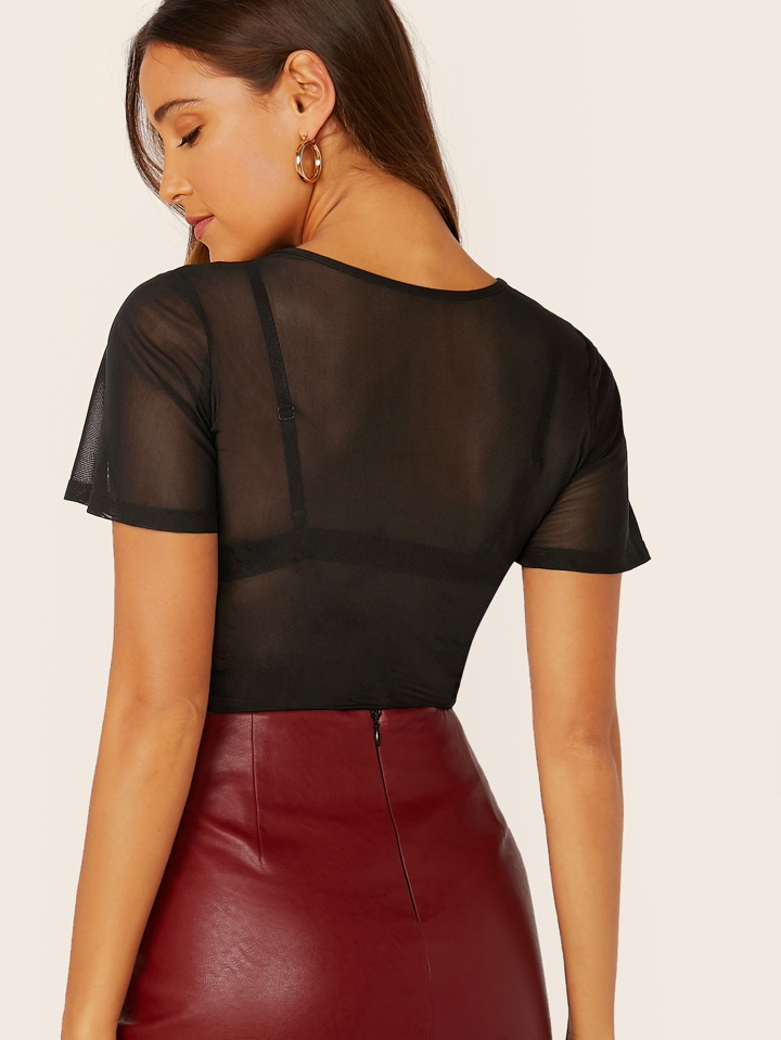 Drawstring Ruched Front Sheer Mesh Crop Top