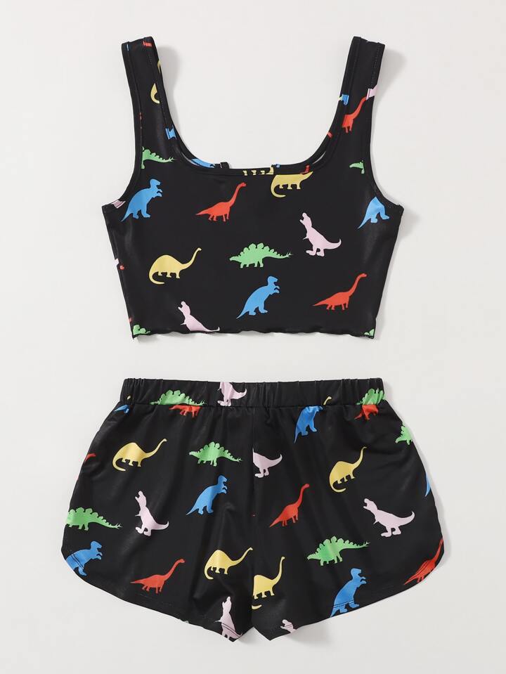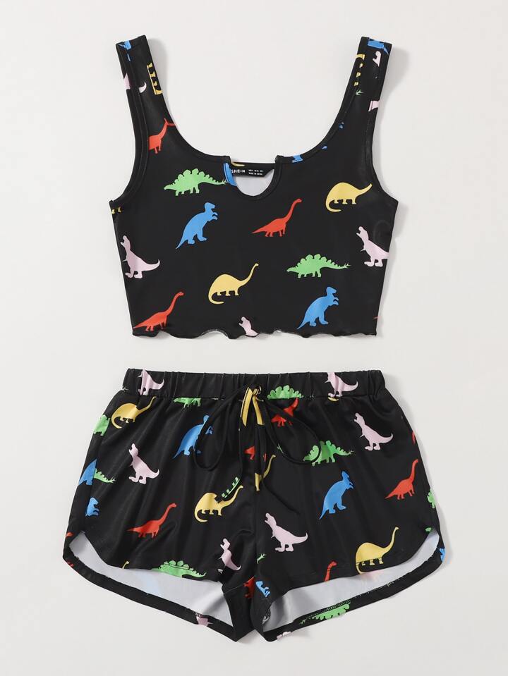 Lettuce Hem Dinosaur Print Tank Top & Shorts Set