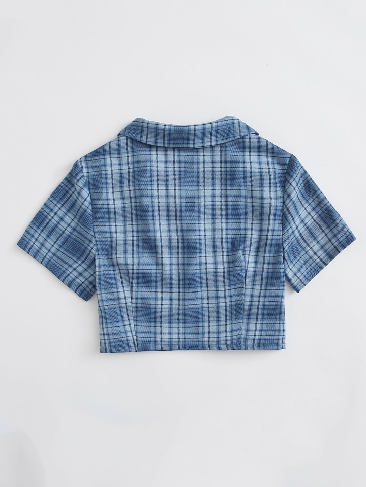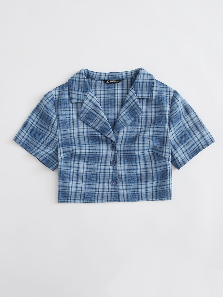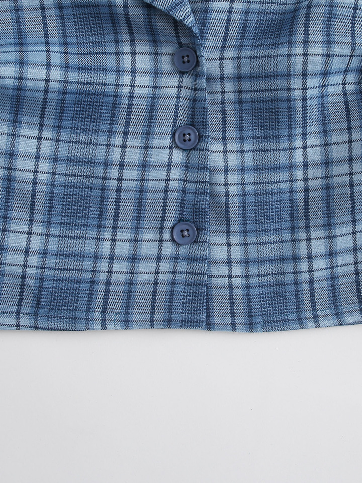 Notched Collar Buttoned Front Tartan Blouse